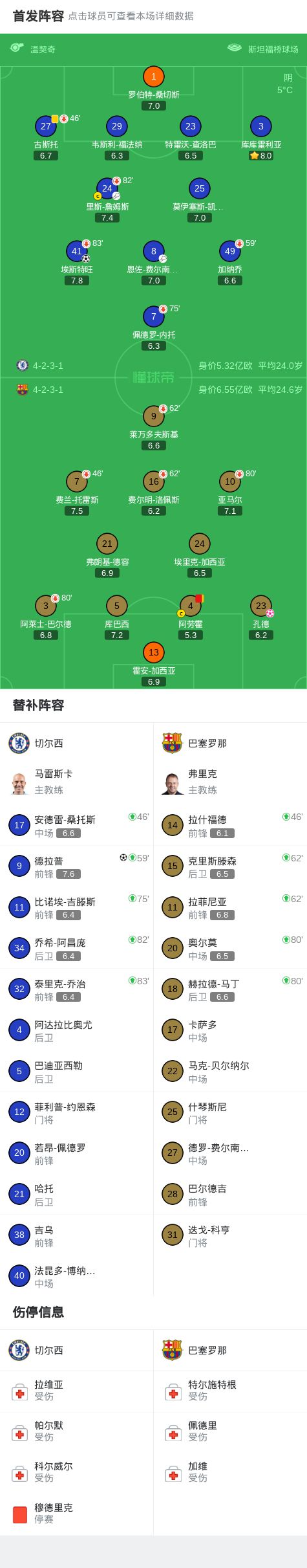 第55分钟,埃斯特旺右路连续过人抽射破门,切尔西2-0巴萨